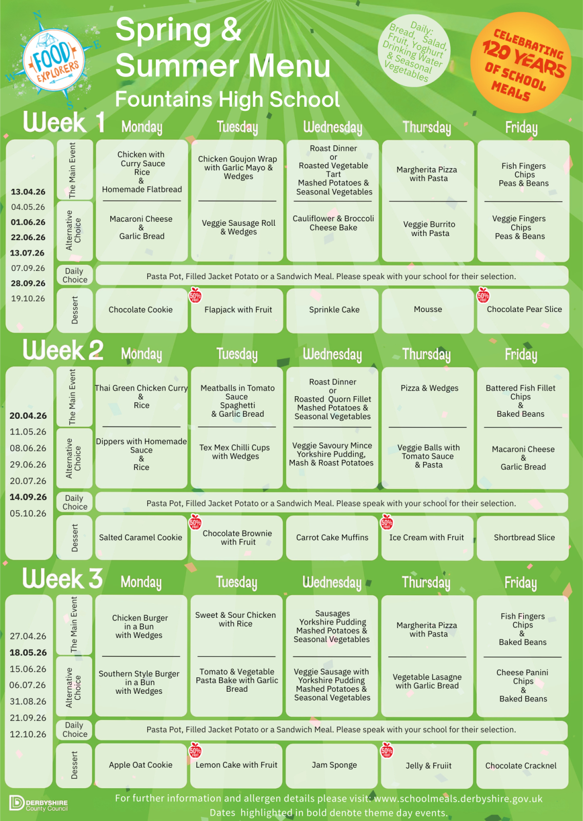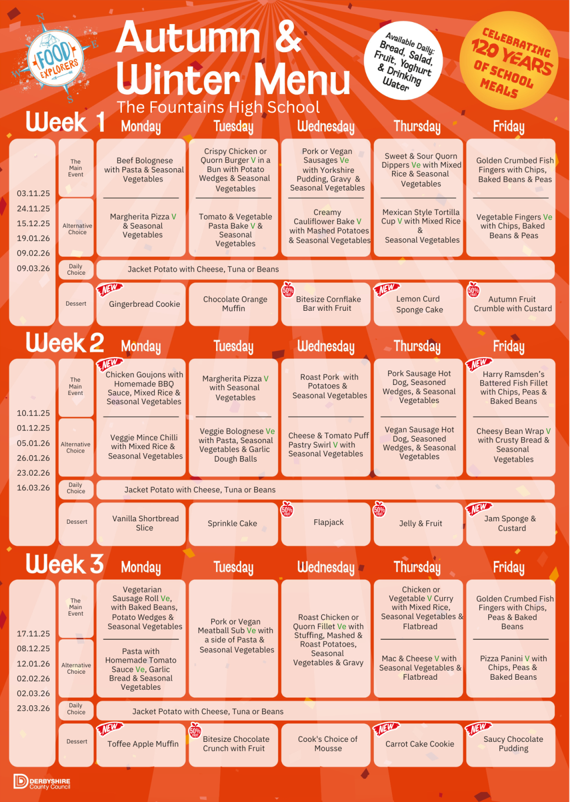 Weekly menus provided by Derbyshire County Council have been planned to offer choice and variety for your child. We provide hot specials of the day, supported by fresh vegetables or salad, a vegetarian choice, hot and cold desserts, snacks and sandwiches. Click HERE to visit DCC Catering website and to find out more about the services they provide.