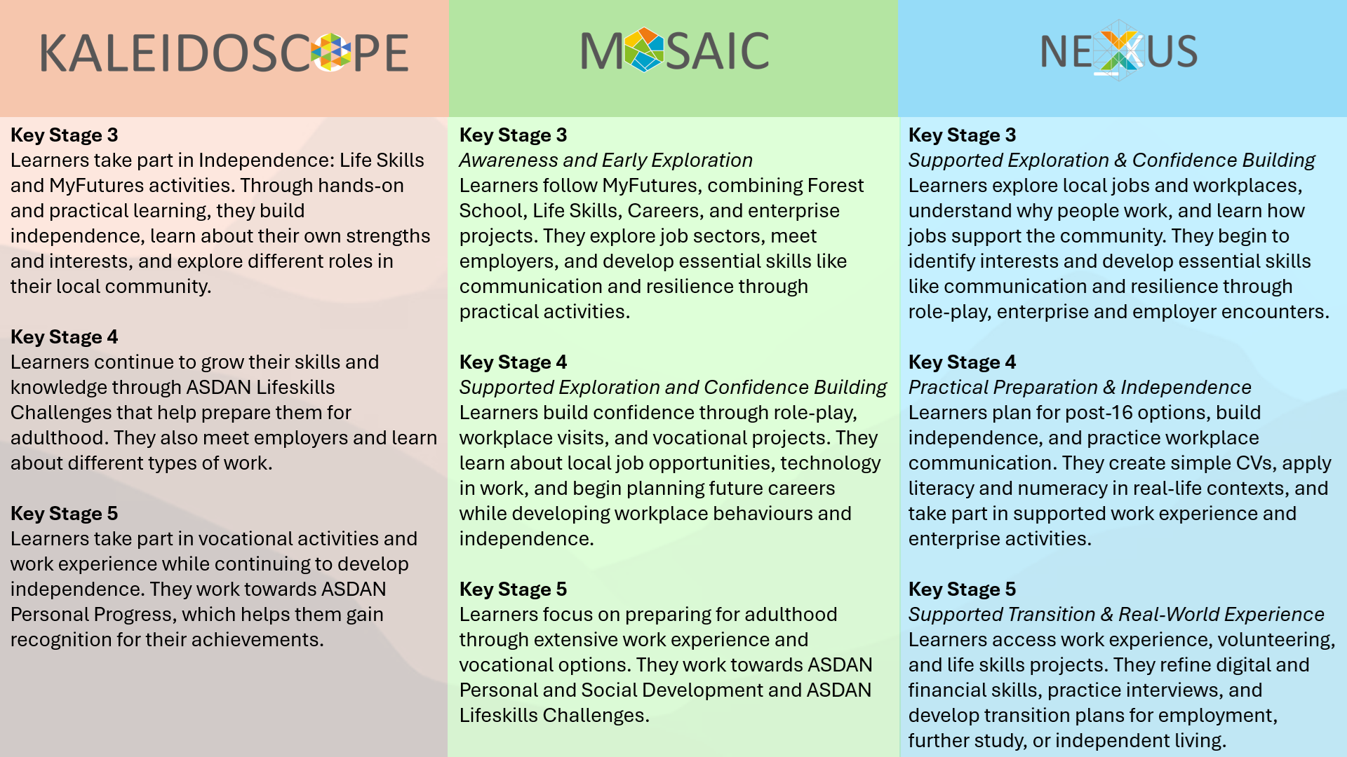 Key Stage 5 – Real-world work experience, volunteering, and vocational qualifications to prepare for adulthood.