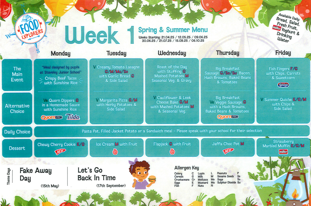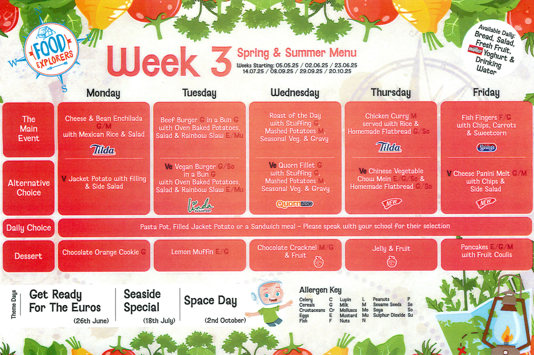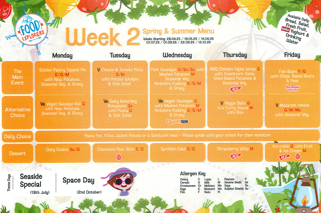 Weekly menus provided by Derbyshire County Council have been planned to offer choice and variety for your child. We provide hot specials of the day, supported by fresh vegetables or salad, a vegetarian choice, hot and cold desserts, snacks and sandwiches. Click HERE to visit DCC Catering website and to find out more about the services they provide.
